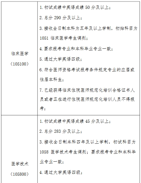 4.报考临床医学类专业学位硕士研究生的考生可按相关政策调剂到其他专业,报考其他专业(含医学学术学位)的考生不可调剂到临床医学类专业学位。
